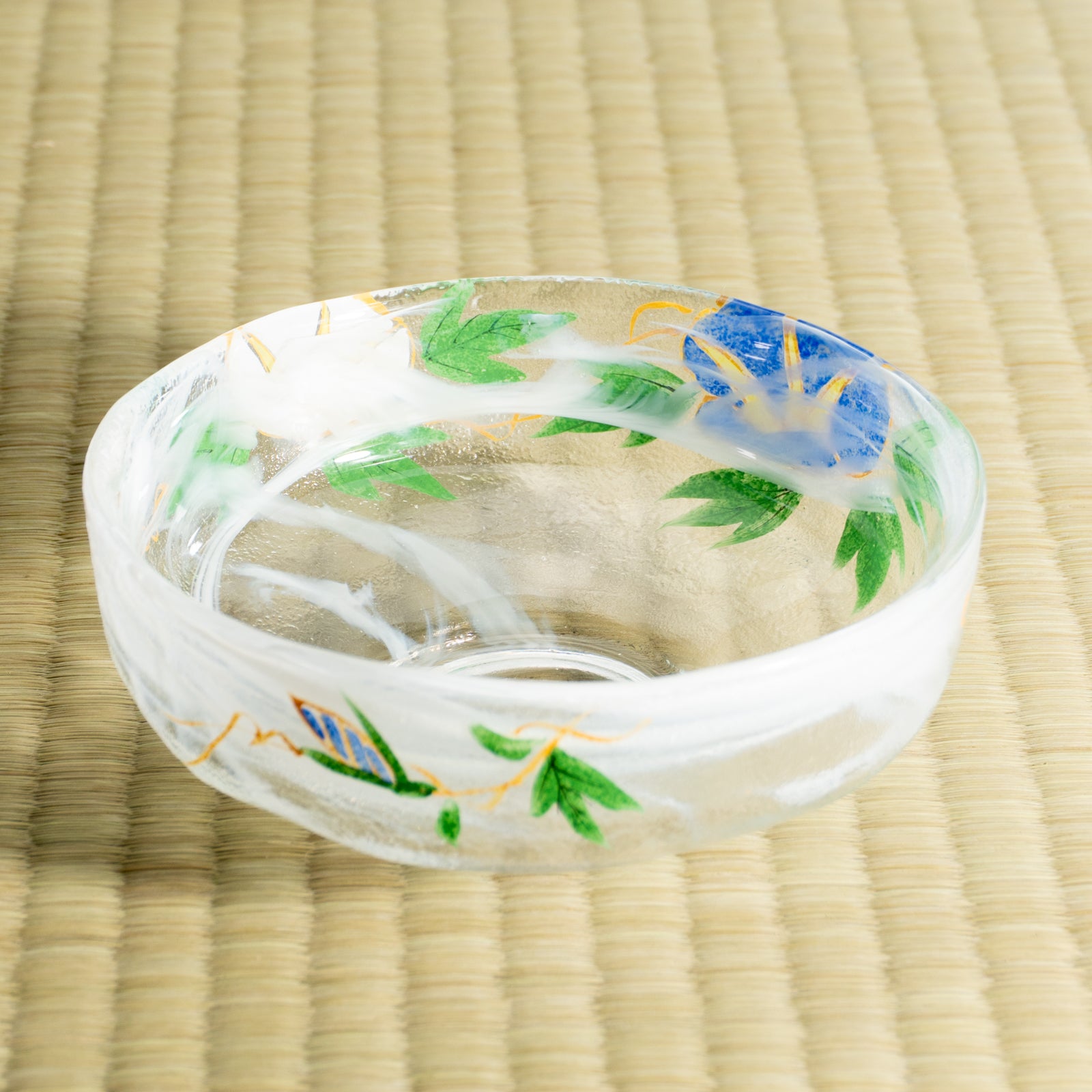 A summer matcha bowl crafted from clear glass, each piece individually hand-painted. The transparency of the glass combined with delicate handmade decoration creates a light, refreshing presence.