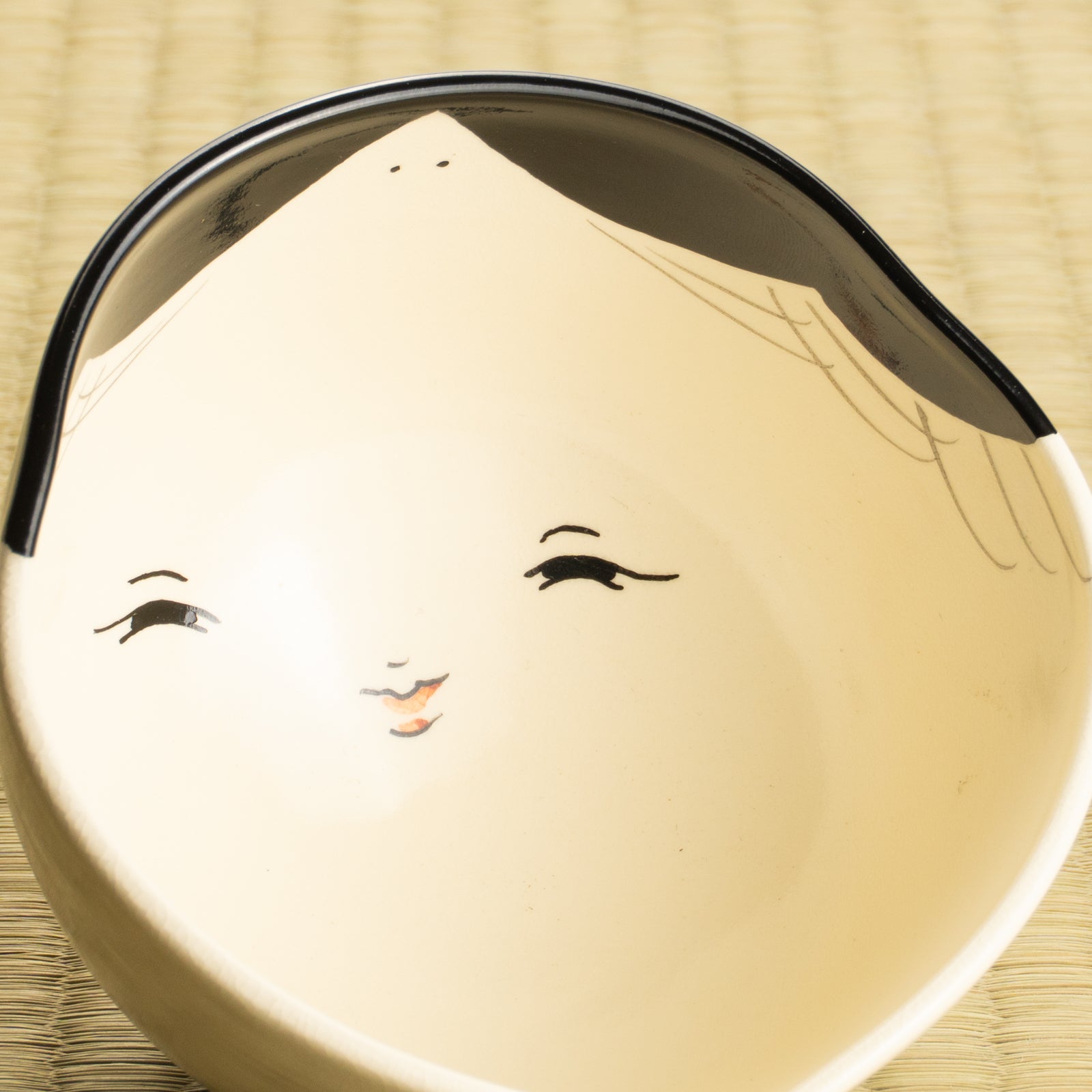 The gentle expression of Okame (O-Fuku) is painted with warmth and charm. The rustic glaze and soft brushwork create an approachable, friendly atmosphere. A piece of tableware that brings a relaxed, welcoming mood to everyday meals.