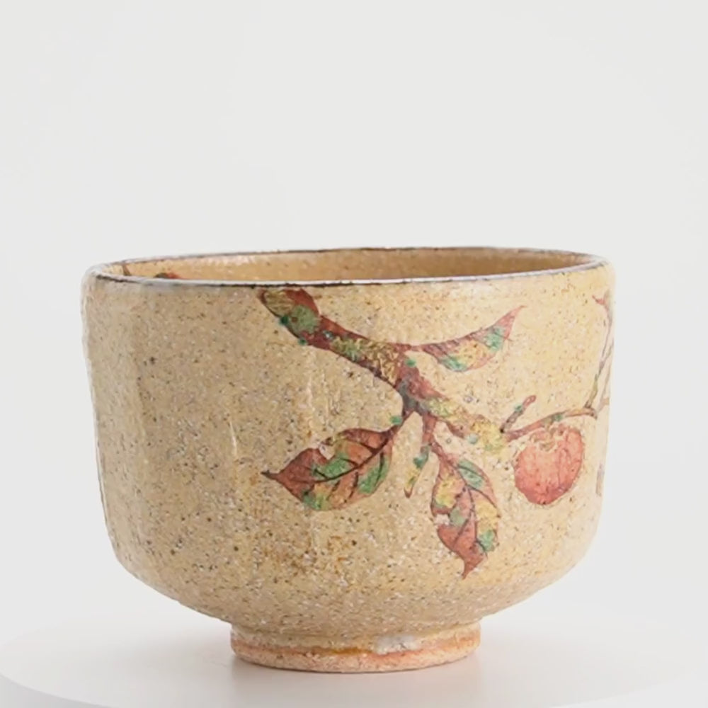 This matcha bowl features a single persimmon left on the branch, known as kimori, painted against a subdued background.