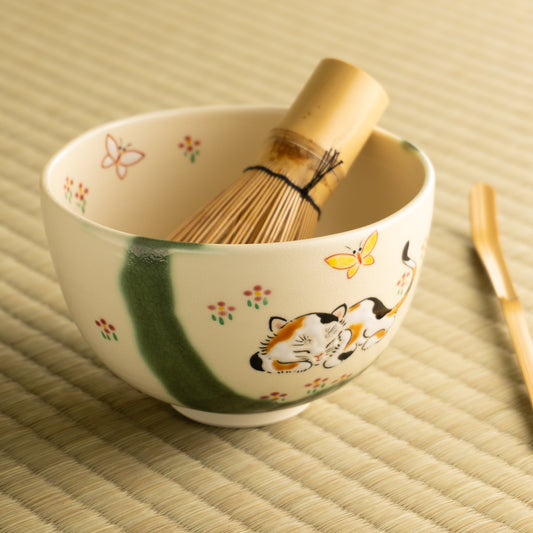 Matcha Bowl – Cat with Oribe Green by Hōsen