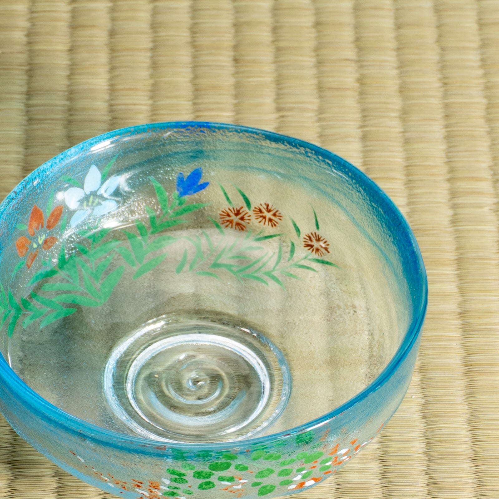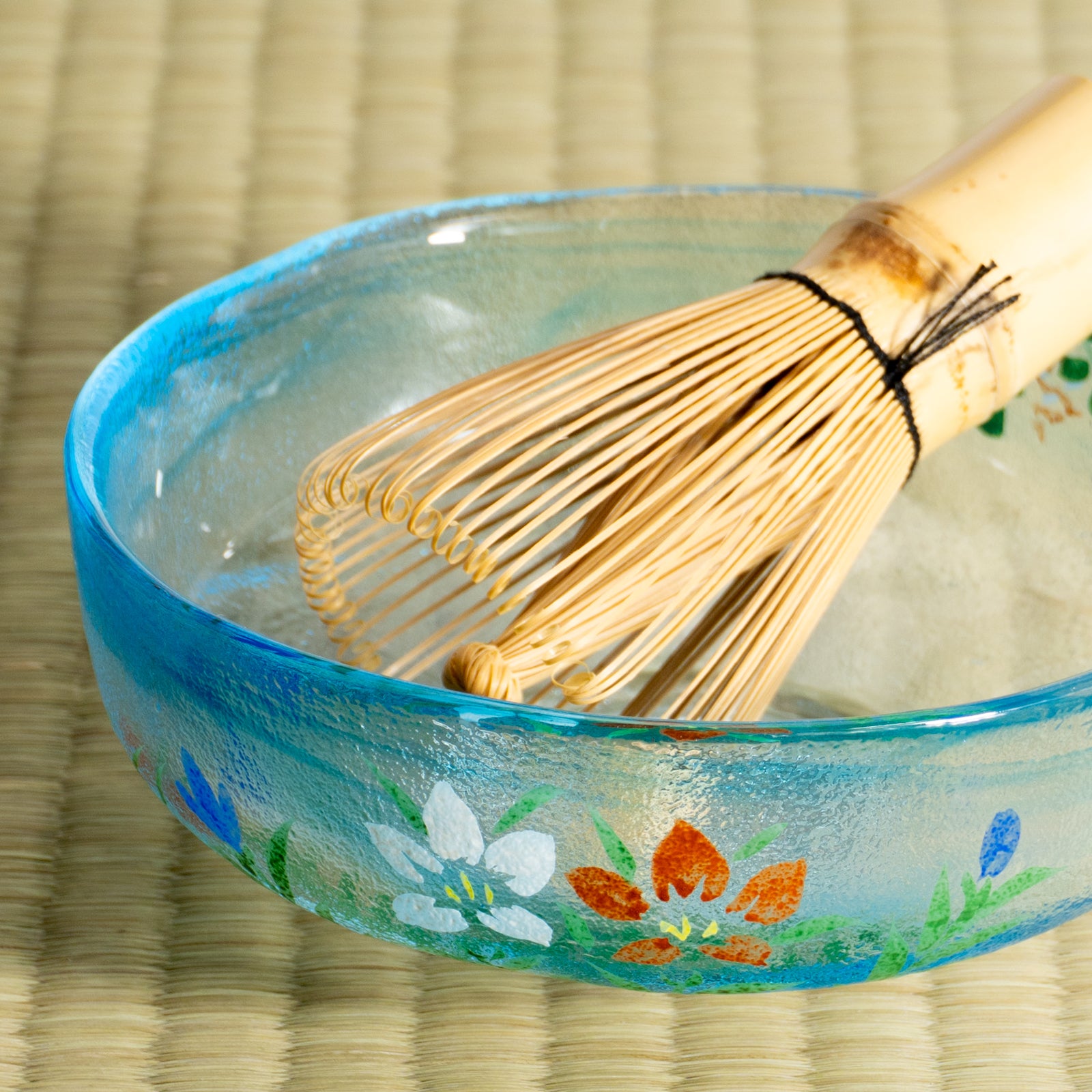 A summer matcha bowl made from clear glass, each piece individually hand-painted. The transparency of the glass paired with delicate decoration creates a light, refreshing impression.