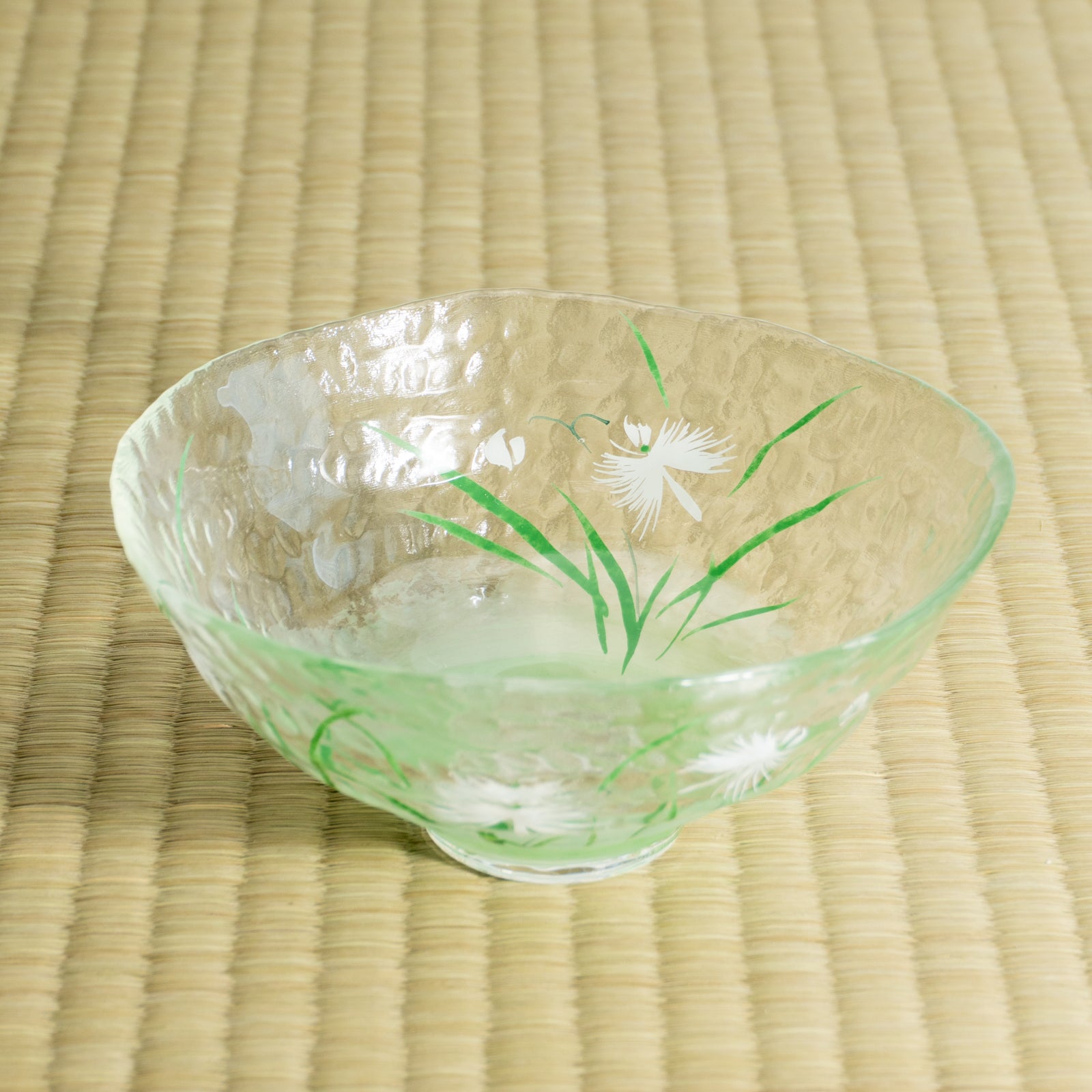Its cool, airy presence brings a pleasant sense of freshness to summer tea moments. The hand-painted design applied on the reverse side subtly shows through the glass, a quality unique to this material. Easy to use not only as a matcha bowl but also as a serving bowl, it is a versatile piece that is also well suited as a gift.