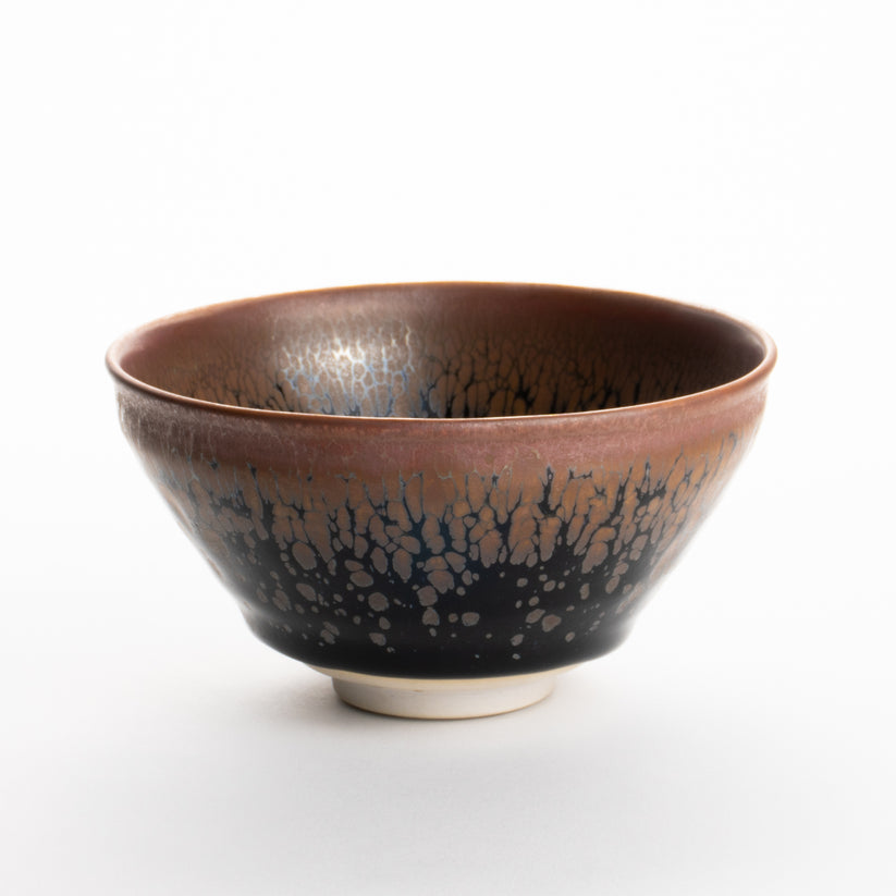 「天目」は鉄分など鉱物を含む釉薬を焼成中に反応させて柄を生み出す焼き物の技術です。数百年の歴史がある由緒あるクラシックな抹茶碗です。