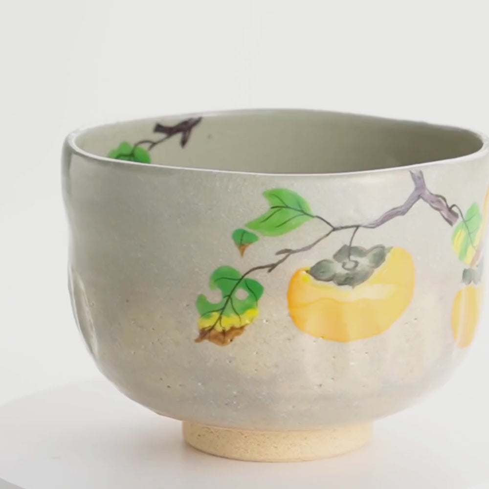陶器特有の温もりある風合いに、柿の絵に映える抹茶碗。
