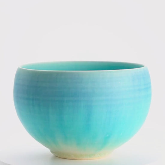 トルコブルーをベースに、淡い水色から深い藍色まで、釉薬が溶け合うように流れます。