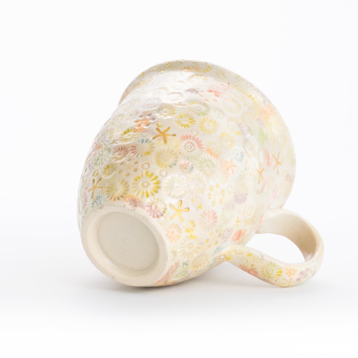 器全体に咲く花模様は、「三島(みしま)」と呼ばれる、陶土に印を押して文様を施す伝統技法によるもの。