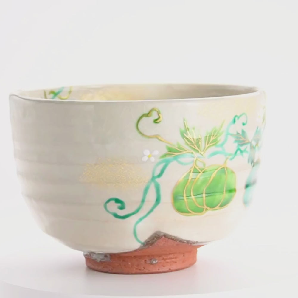 手描きの華やかな文様が魅力の、京焼・清水焼の抹茶碗です。