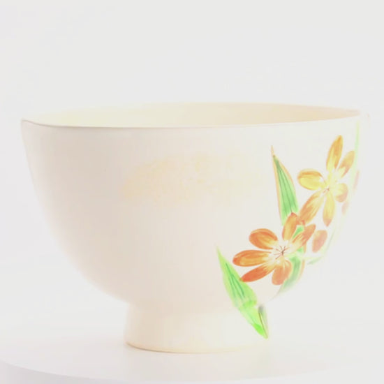 手描きの華やかな文様が魅力の、京焼・清水焼の抹茶碗です。