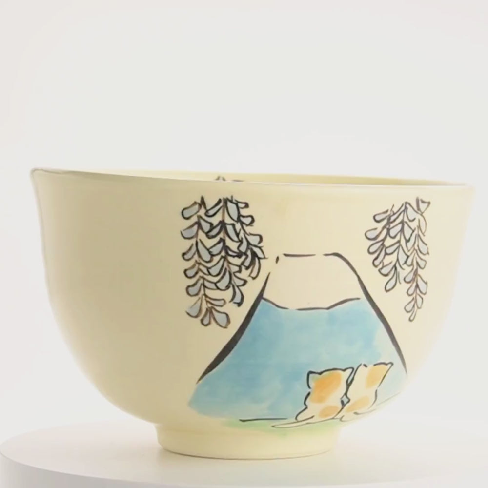 抹茶碗 仲良し猫「富士山と藤」 工房咲楽