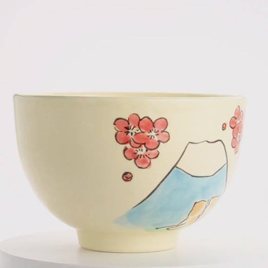 京都・精華町の工房“咲楽(さくら)”から届いた、富士山と動物たちを描いた、心なごむ清水焼の抹茶碗です。