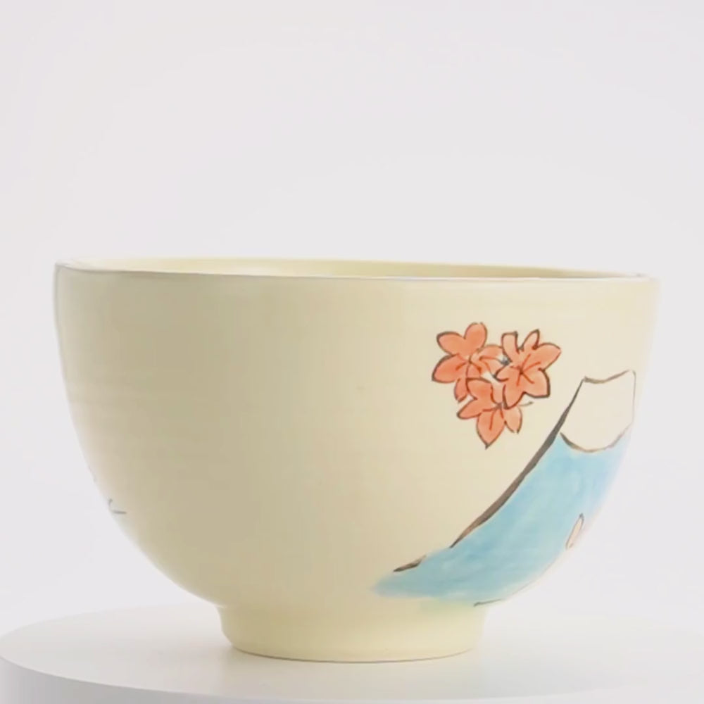 京都・精華町の工房“咲楽(さくら)”から届いた、富士山と動物たちを描いた、心なごむ清水焼の抹茶碗です。