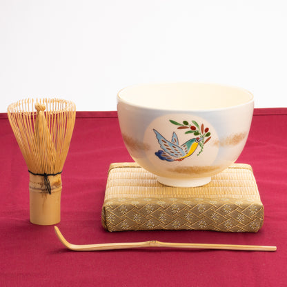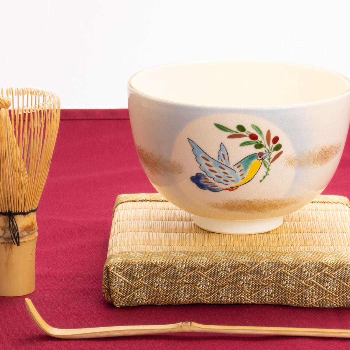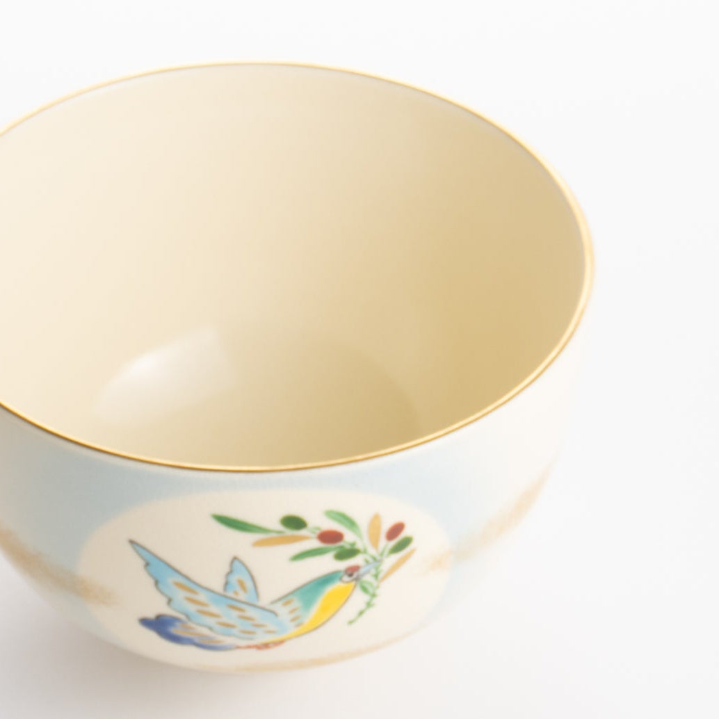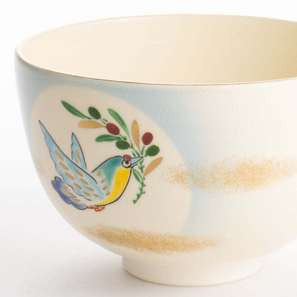 平和の象徴のトリを描いたとても縁起のよい抹茶碗です。乳白色の地色は仁清(にんせい)と呼ばれる京都特有の柔らかい色合い。金彩や鮮やかな色彩の絵付けがされていて、とても京都の焼き物らしい抹茶碗です。