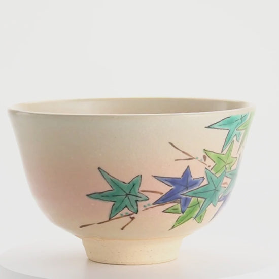 やさしい風合いの土肌に、鮮やかな青楓が描かれた抹茶碗です。