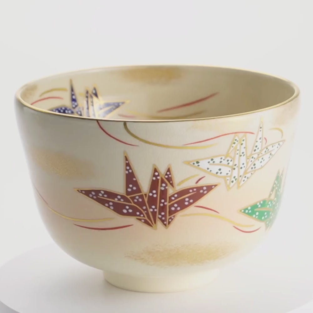 色とりどりの折鶴が舞うように描かれた抹茶碗。