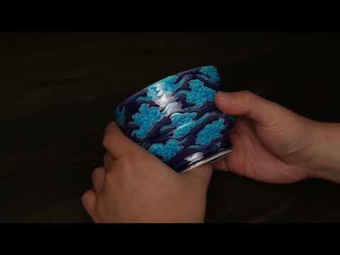 这款抹茶碗以深海军蓝为底,上面绘有浅蓝色的吉祥云朵。