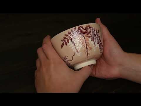 这款抹茶碗以淡粉色的科奇为背景,饰以柔和下垂的紫藤花图案。