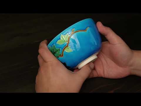 这款抹茶碗以柔和的浅黄色高知底色为背景,饰以翠绿的枫叶图案。