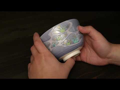 这款抹茶碗以淡紫色高知为背景,饰以新鲜的稻苗图案。