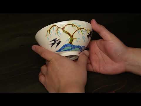 这款扁平的抹茶碗以光泽亮丽的白鹏纹为底,上面绘有飘逸的柳树和翱翔天际的燕子。