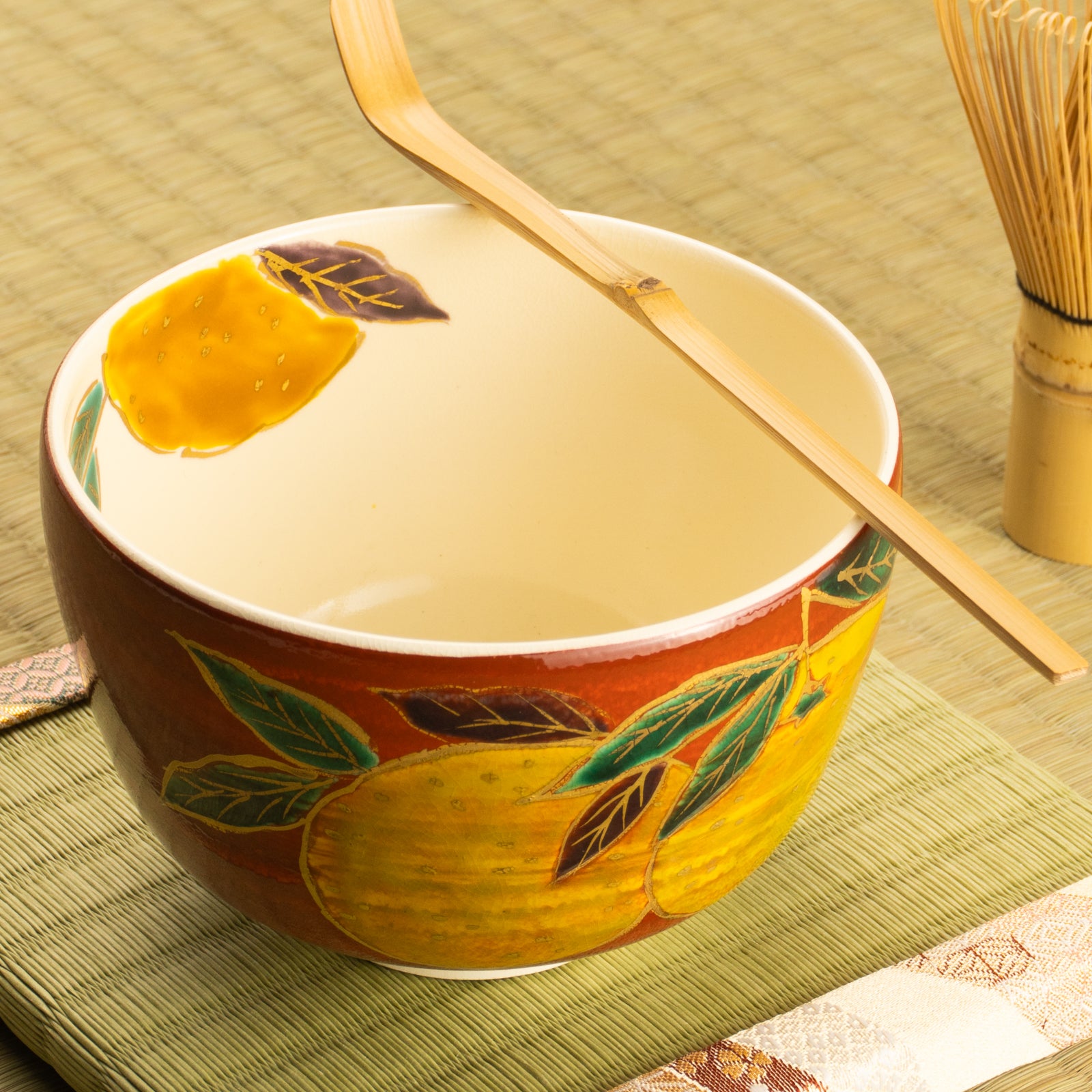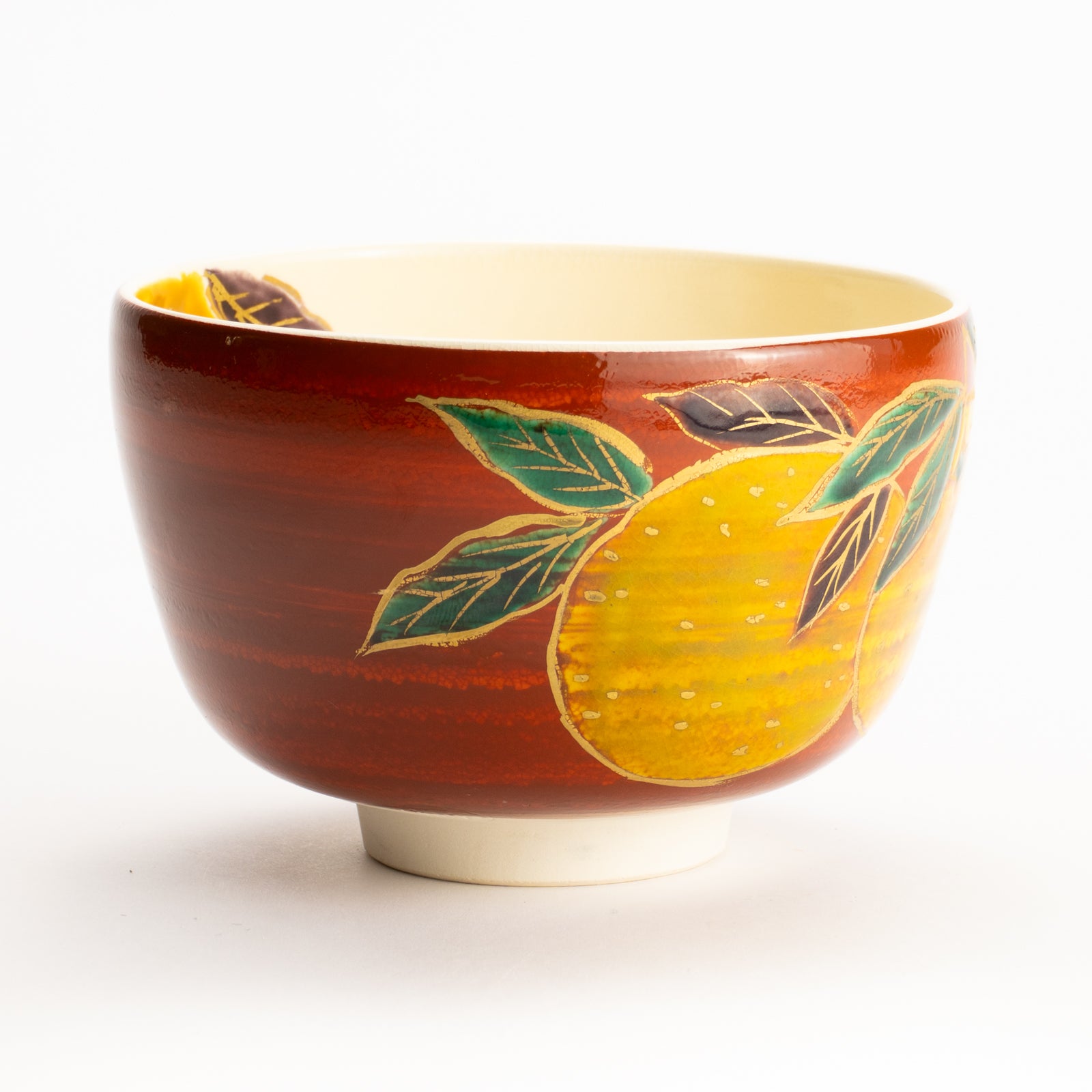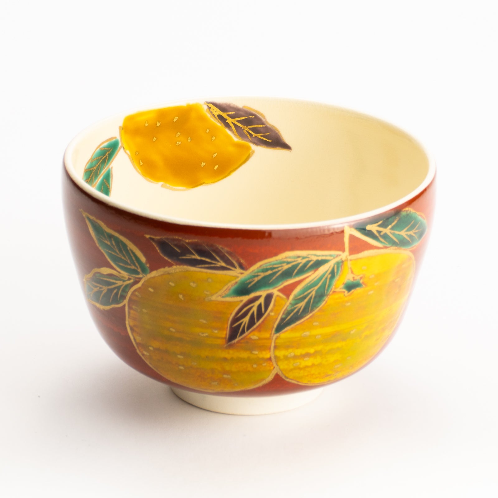 光泽的红色釉面与柚子的柔和黄色相得益彰,衬托出抹茶的绿色。