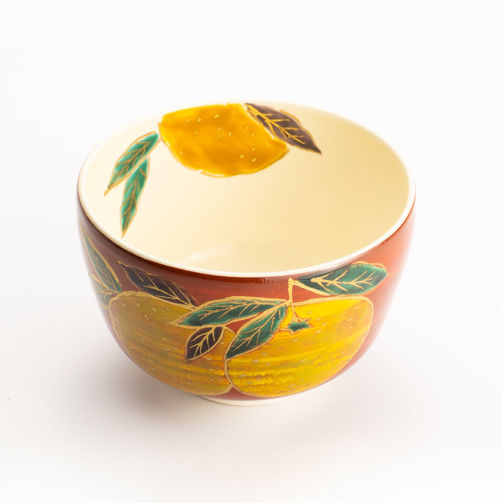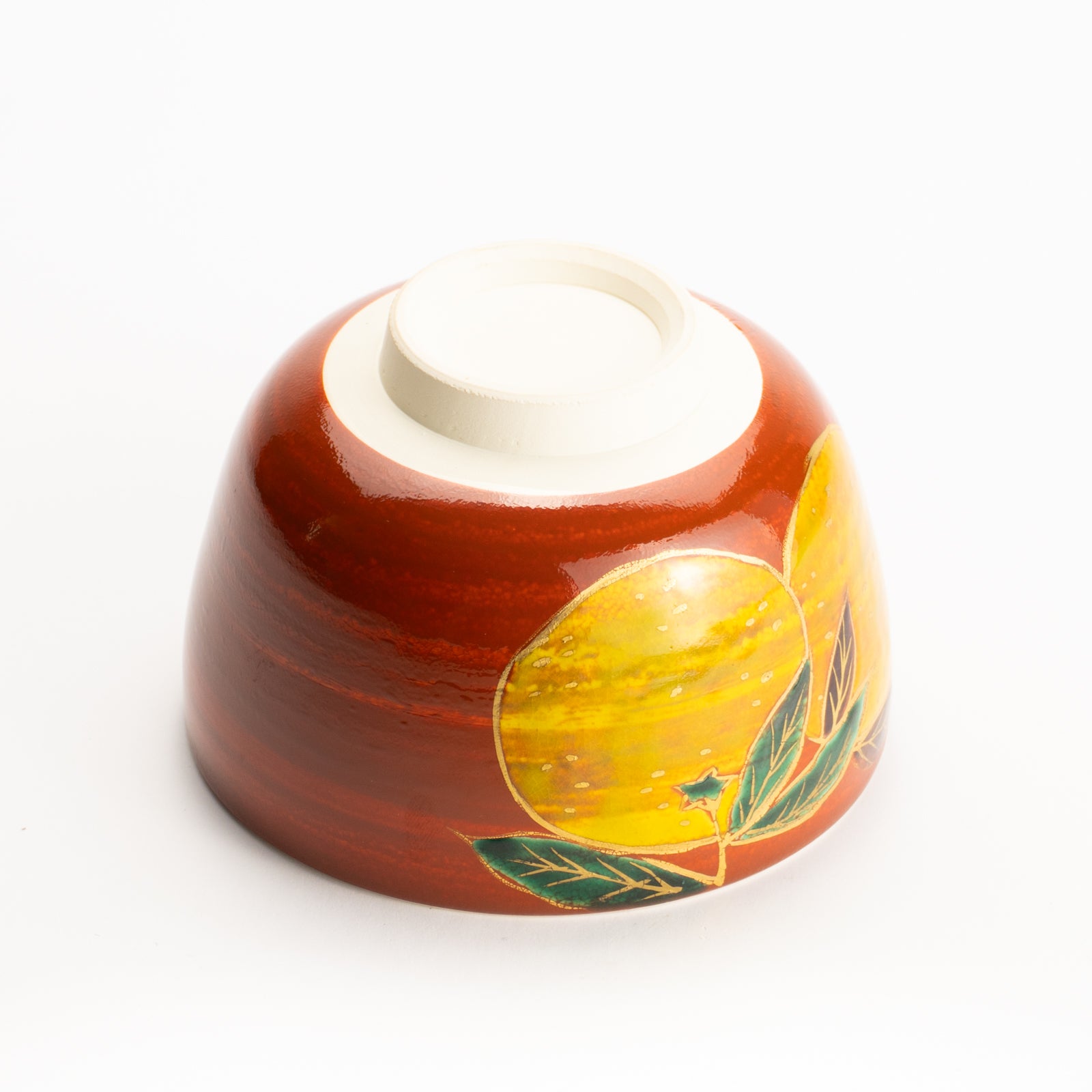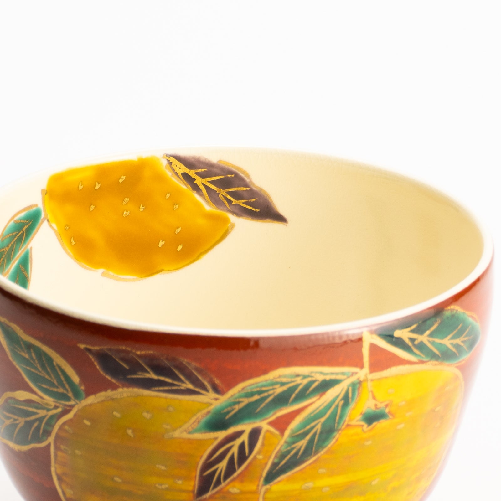 光泽的红色釉面与柚子的柔和黄色相得益彰,衬托出抹茶的绿色。