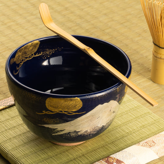 【清水烧】抹茶碗 瑠璃地金银彩《富士与松》 海峰