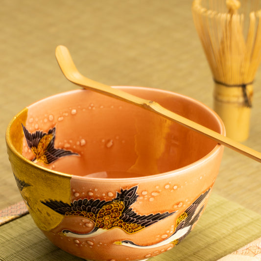 【清水烧】抹茶碗 朝霞与鹤 一如