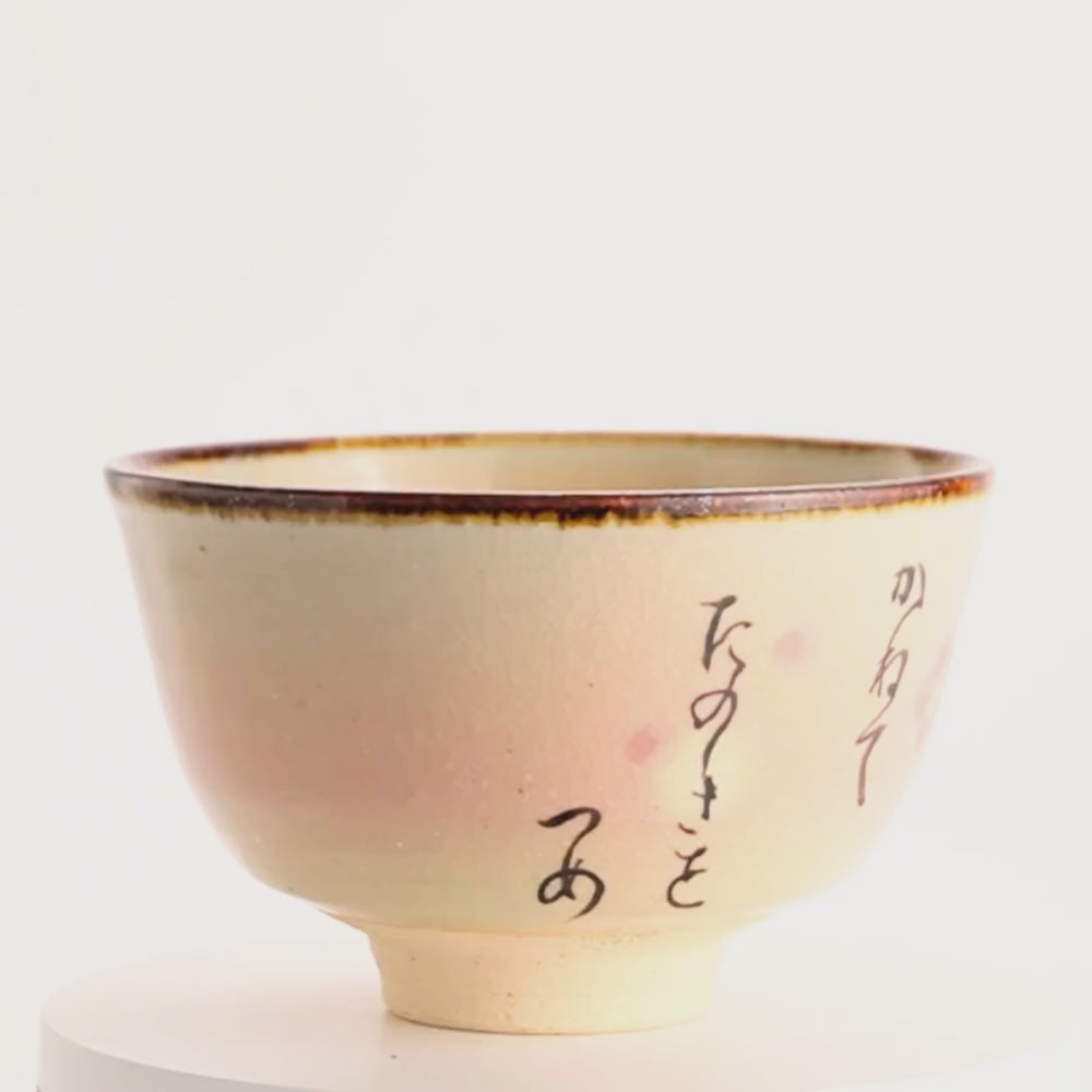 一只精致的抹茶碗,上面绘有《古今和歌集》中的一首诗。
